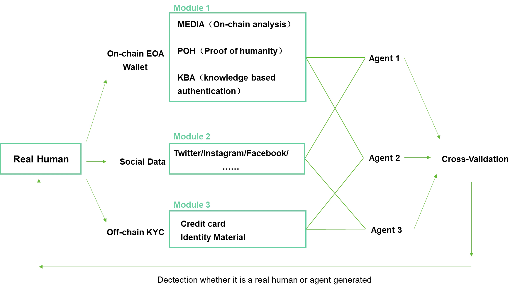 上图展示了多个假想模块的协作。此外,Trusta 刚刚开始探索多代理协调方法,以构建身份验证代理系统。下图展示了该架构。我们正在不断改进这一框架,以便在 AI 时代,不同实体能够被分配正确的身份。