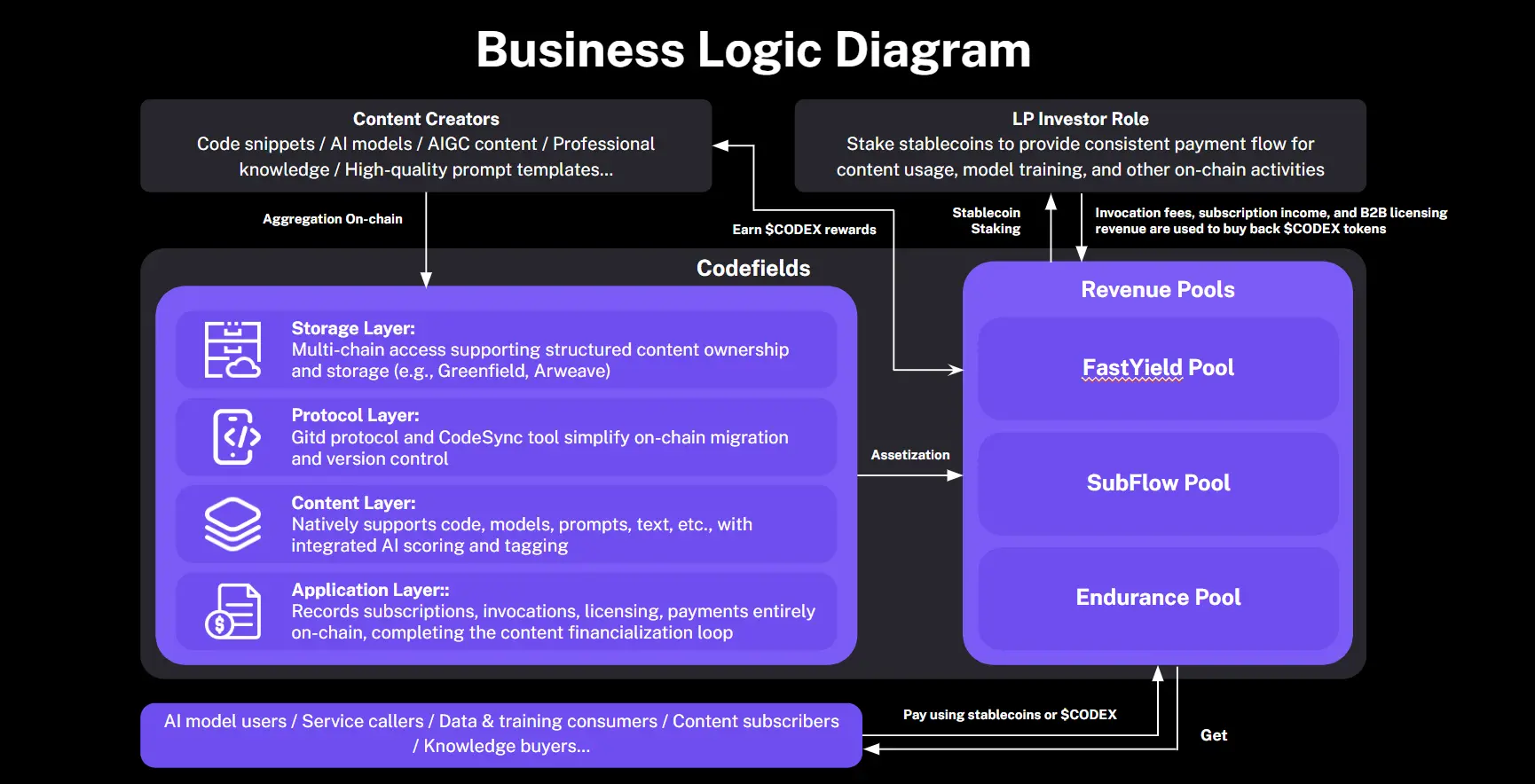 CodexField 还集成了基于 AI 的评分和语义标签系统,自动评估和注解内容的质量、可信度和适用场景。这为内容推荐、风险警报和金融定价提供了重要输入。内容行为数据(如使用频率、引用次数、收益)也被用于声誉评分和资产估值模型。