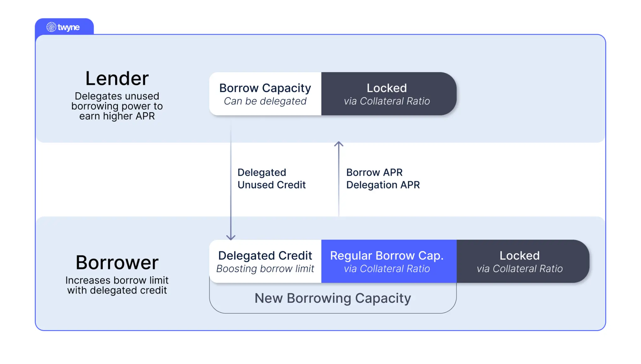 Twyne 上的借款人可以获得超出其在原始借贷协议中抵押品所允许的杠杆额度。借助 Twyne,他们可以利用 CLP(出借人)授权的借贷额度,临时提升其贷款价值比(LTV)。