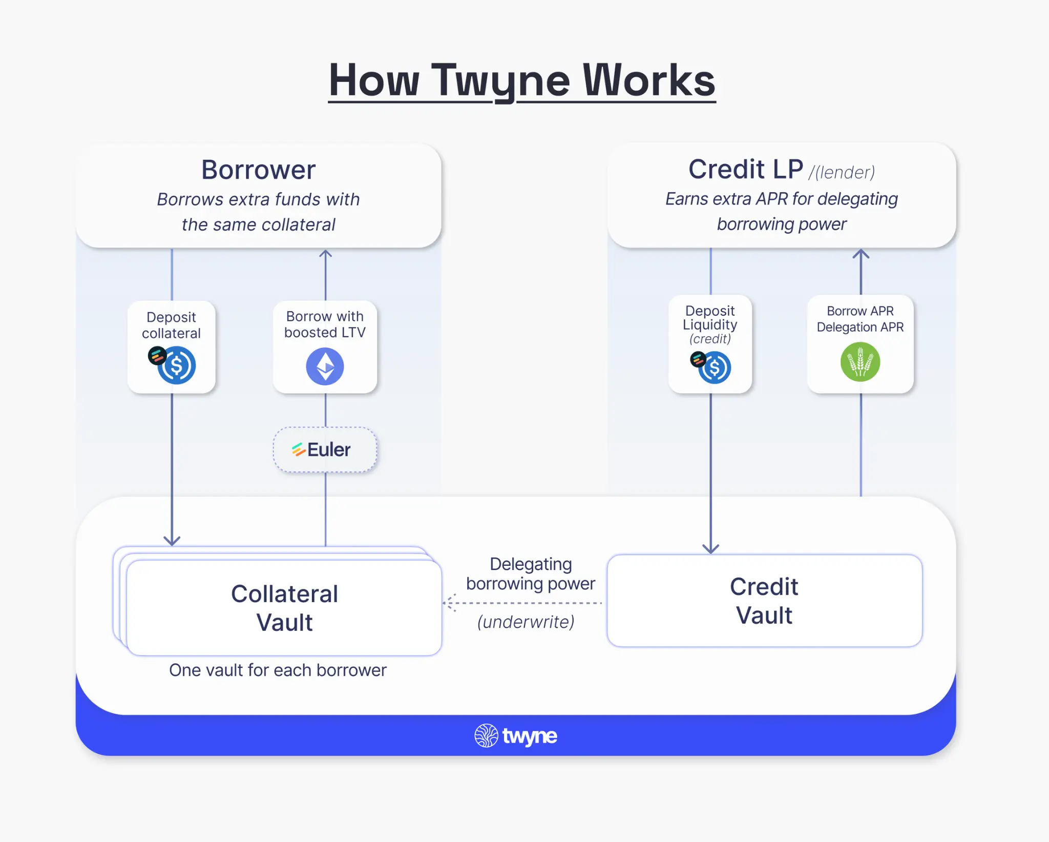 Twyne 直接集成至如 Euler 等成熟的借贷市场,允许用户存入代表其底层市场头寸的 IOU 代币(如 euler_USDC)。通过存入这些代币并授权其未使用的借贷额度,用户可从借款人处获得额外的年化收益率(APR),而借款人则能在使用相同抵押品的前提下,获取高于原始市场的贷款价值比(LTV)。