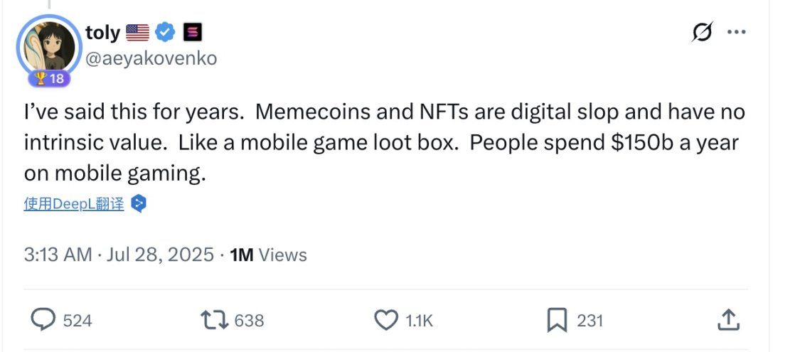 尽管 Solana 在 24 年到 25 年第一季度从 Memecoin 驱动的活动中大大受益,但 toly 本人却表示其已经多次公开说明 memecoin 没有内在价值。