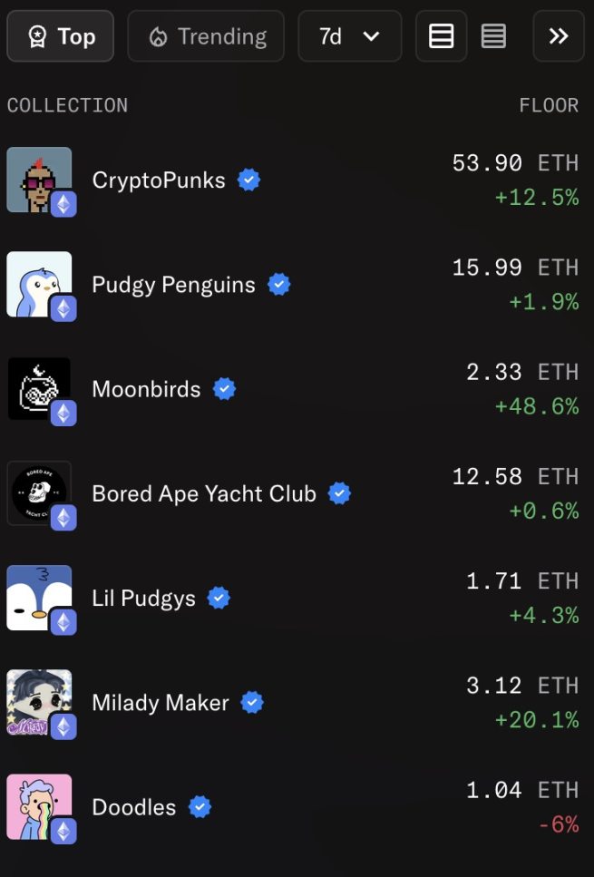 其余 ETH 蓝筹 NFT 在一周内也基本联动上涨。Moonbirds 地板价突破 2ETH,上涨近 50%;Milady Maker 地板价突破 3ETH,上涨超 20%。