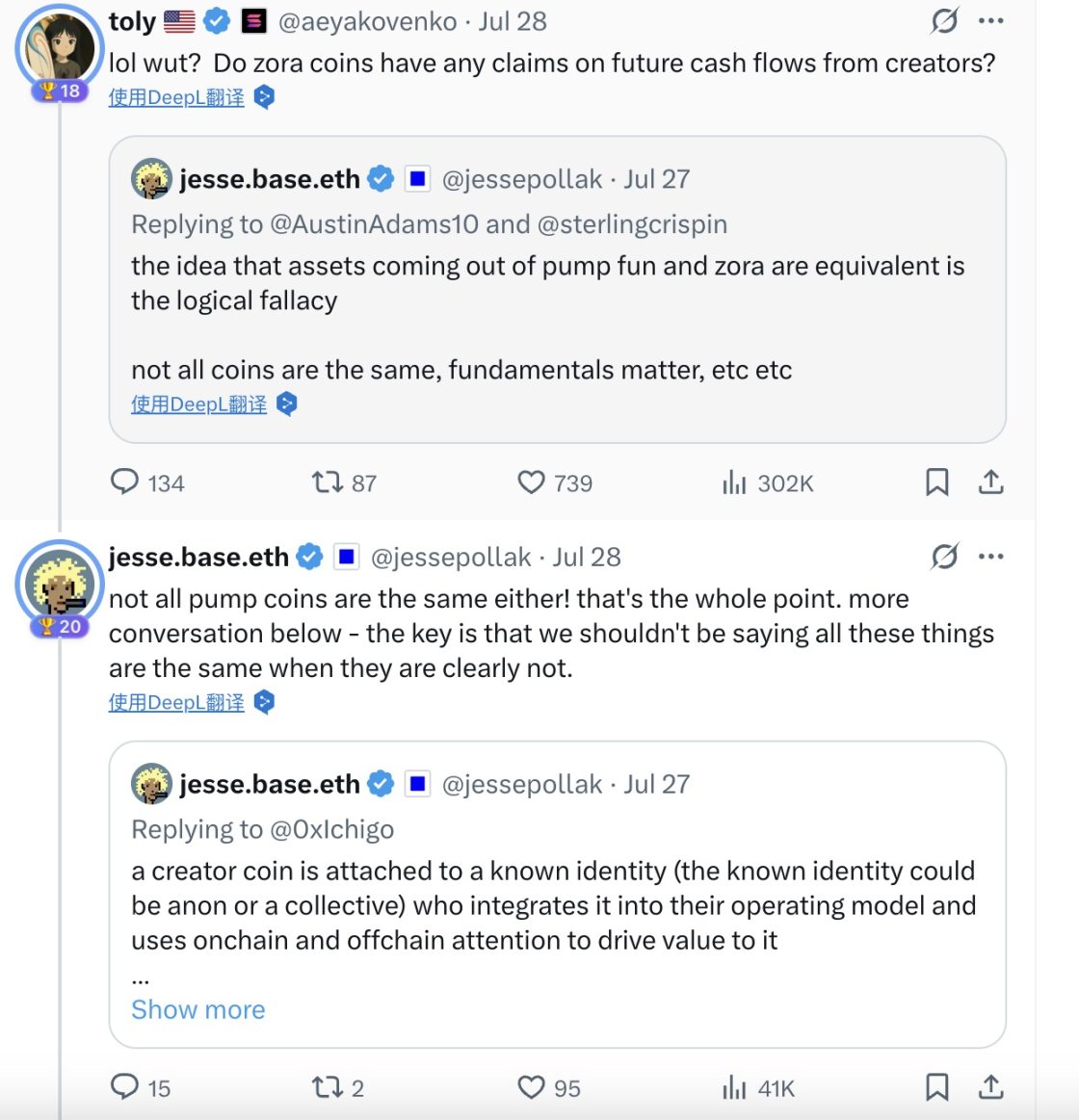 其中,Jesse Pollak 称 Zora 上的创作者代币的内容和创作者具有独特价值,将其 Pump.fun 上的代币同等是逻辑谬误。而 Anatoly Yakovenko 表示这些代币不过是病毒式传播产物,买家只是想趁热转手。Pollak 反驳称代币是赋能创作者价值流动的强大技术,不认同者可坚持「内容无价值」观点。