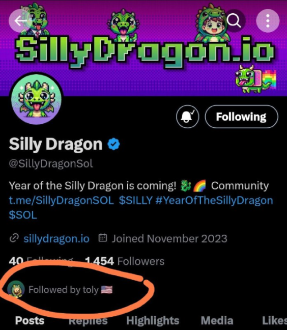 在 Silly Dragon 创建后,仅有 1454 个粉丝时,toly 就已经点上了关注。这一举动在当时使得 Silly Dragon 在 1-2 小时内短时暴涨 10 倍。