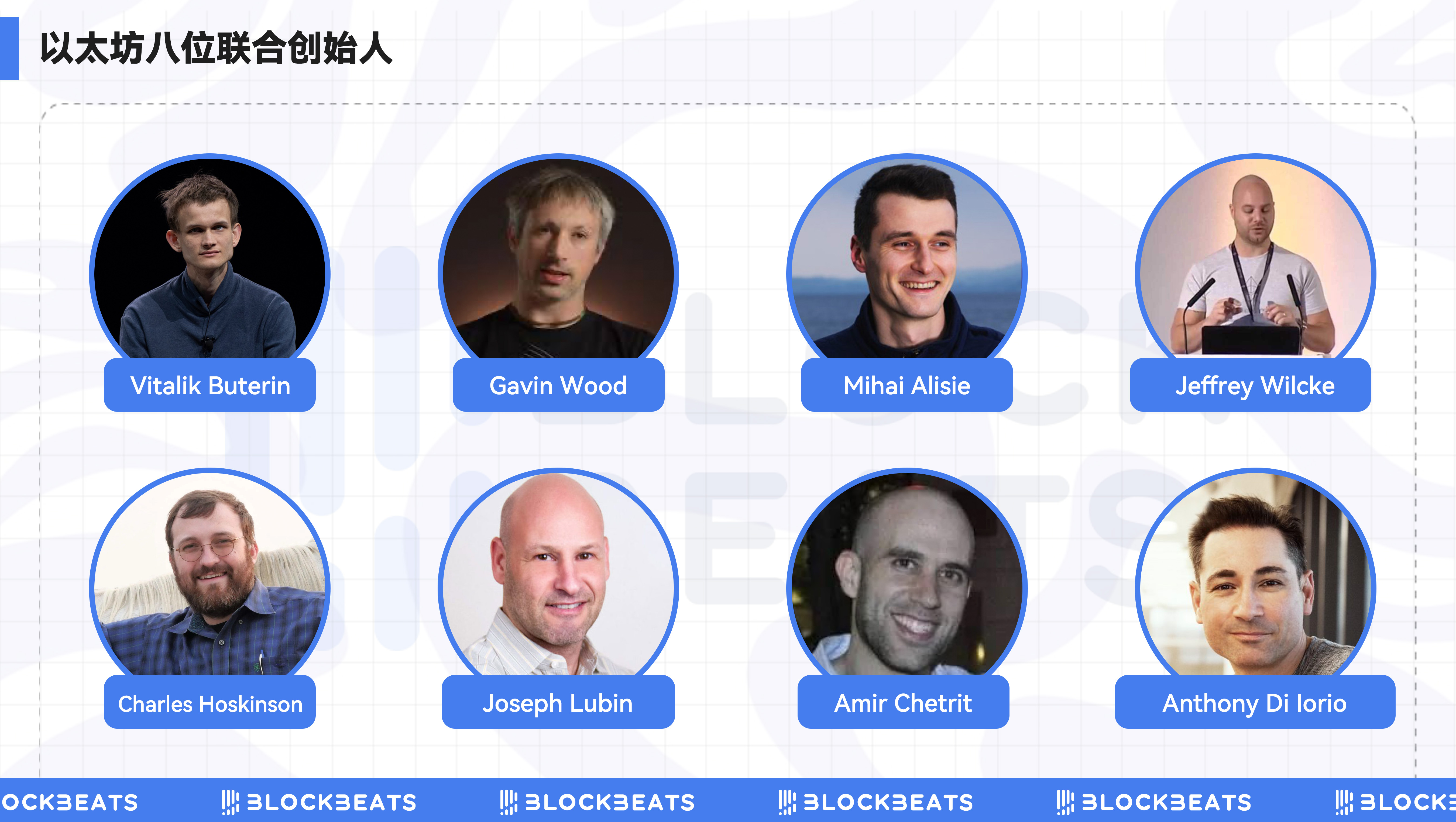 关于以太坊的联合创始人,这是一个有争议的话题,网络上的版本又很多,甚至连维基百科的相关条目也不断地被编辑修改。在 Vitalik「亲口认证过 8 位联创」之后,社区广泛认可的版本是:继 5 位创始人之后,在 2014 年有另外三位开发者成为了联合创始人: Joseph Lubin、Gavin Wood 和 Jeffrey Wilcke。