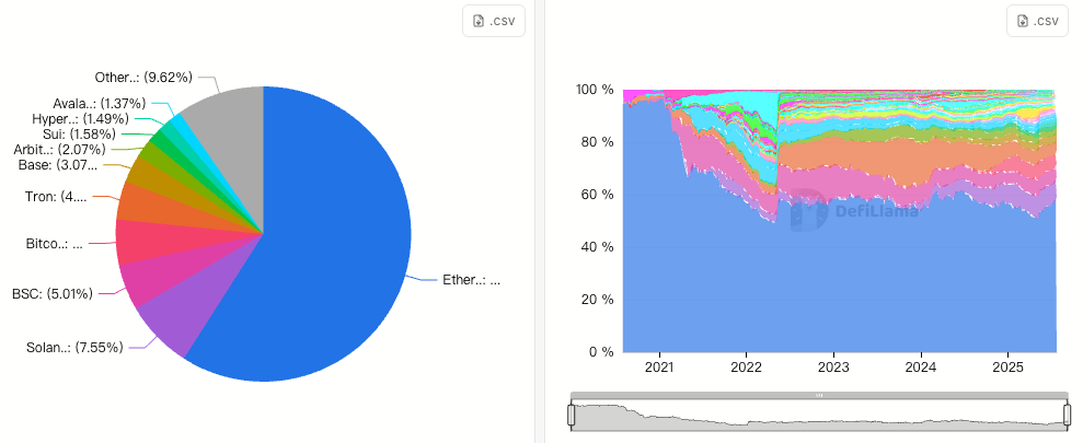 不仅如此,BNB Smart Chain 等公链也分食了部分 GameFi、山寨币交易等流量。尽管以太坊依然是 DeFi 协议数量和 TVL 最大的生态,截至 2025 年 7 月约占据全行业 56% 的 DeFi 活动,但不可否认,多链并存格局下,以太坊的相对统治力较巅峰时期已有下降。