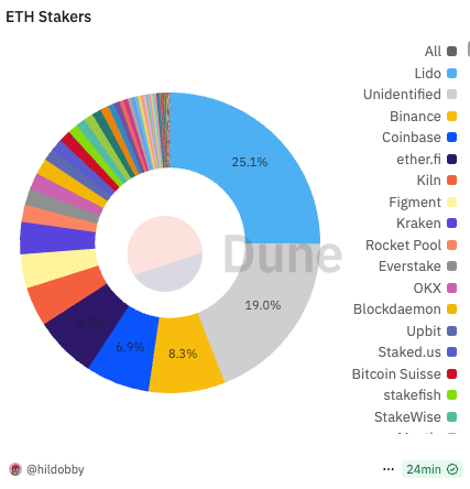 向 PoS 转型后,质押集中化的问题引发社区担忧。按规则,参与以太坊网络验证需要质押 32 ETH 门槛,这促使散户通过质押池或交易所委托的方式参与,进而形成少数大型质押服务商主导的局面。最大的去中心化质押池 Lido 曾一度占据全网超过 32% 的质押市场份额。随着更多竞争者加入,Lido 占比略降至约 25%,但依然遥遥领先于排名其后的币安(约 8.3%)、Coinbase(约 6.9%)等实体。社区普遍忧虑,若任何单一实体持有超过 1 / 3 的验证权重,将可能影响区块共识甚至网络安全。
