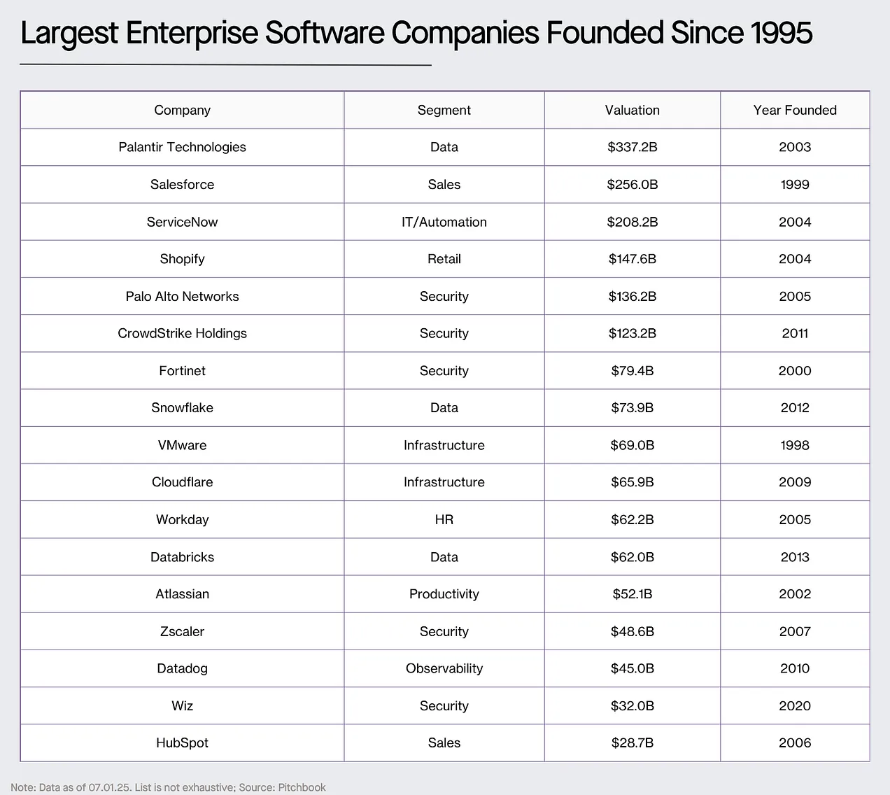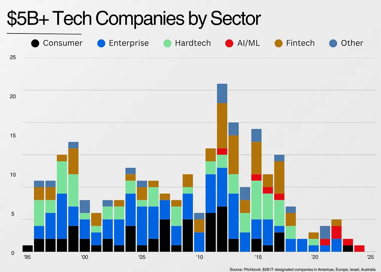 关于方法论:绝大多数技术价值都集中在最大的公司身上,因此我选取了自 1995 年以来成立的所有 Pitchbook 上标有 IT 价值 50 亿美元以上的公司。(注意:这不包括亚马逊、Nvidia、微软和苹果。)我让 Claude 帮助对这些公司进行分类,因此我认为确切的数据在方向上非常准确,但在本质上并不准确。
