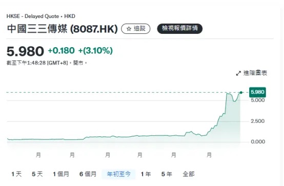 7 月 15 日,中国三三传媒公告称,公司已𫔭展申请稳定币牌照的筹备工作,7 月 16 日,中国三三传媒收盘飙涨 72.73%,今年以来其累计涨幅高达 14.95 倍。