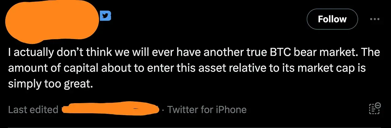 著名耶鲁大学经济学家欧文·费舍尔(Irving Fisher)曾说过,在 1929 年股市崩盘前夕,股价已经达到了“永久保持高位”。费舍尔(Irving Fisher)的这番言论体现了市场触顶时通常所特有的那种欣快自信。即使是最狂热的比特币多头,至少在短期内,也应该警惕类似的笼统论断: