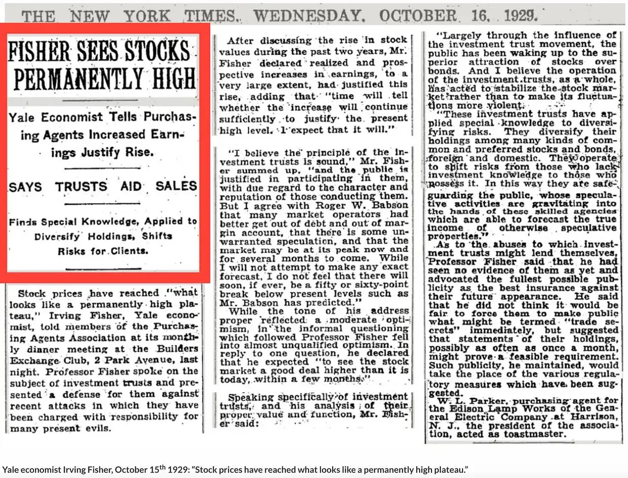 费舍尔(Irving Fisher)关于市场“高位”的名言如今已广为人知,但其鲜为人知的背景却揭示了更深层次的故事。他实际上是在为投资信托辩护,认为它们是股票估值的重要支撑,就像今天比特币支持者提到比特币财库公司内置需求一样。《纽约时报》当时如下报道: