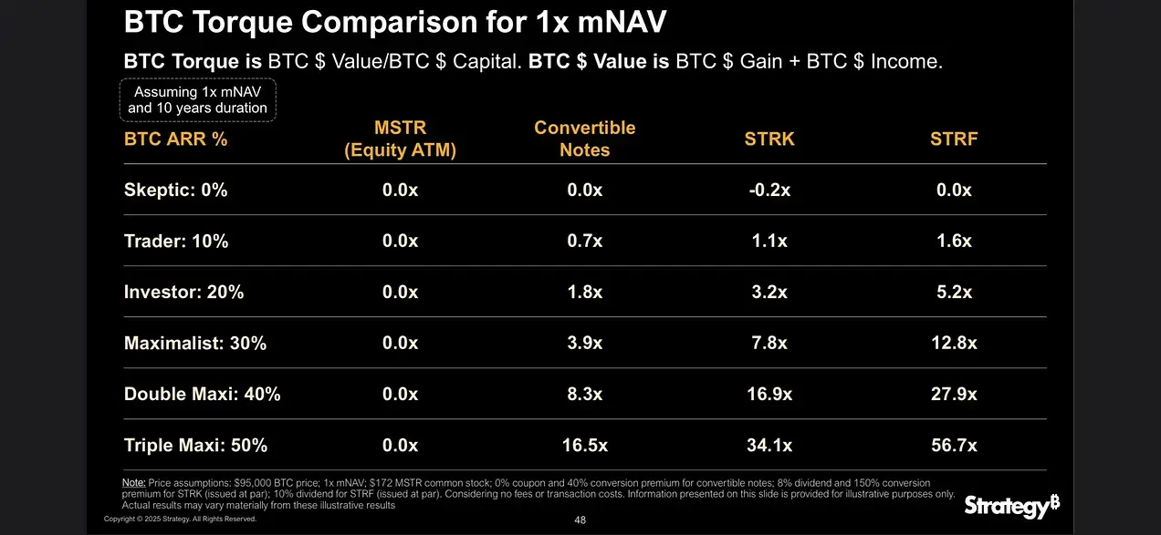 MicroStrategy 提供了一个视频和表格,展示了其资本结构不同层级(股票、可转债、优先股等)的“杠杆效应”——本质上是对比特币价格变动的放大敞口:
