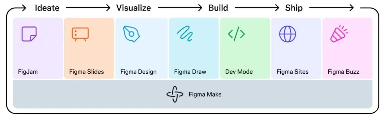 Figma的多产品策略实际上是在构建一个完整的数字产品生命周期生态系统。从最初的创意讨论(FigJam)到具体的设计执行(Figma Design),从开发交付(Dev Mode)到内容营销(Figma Buzz),从网站建设(Figma Sites)到演示汇报(Figma Slides),每个产品都覆盖了数字产品开发过程中的关键环节。 更重要的是,这些产品之间不是简单的功能堆叠,而是形成了有机的协同关系 :在FigJam中产生的创意可以直接转化为Figma Design中的设计元素,Design中的组件可以自动生成Dev Mode中的代码规范,设计资产可以无缝应用到Slides的演示文稿中。