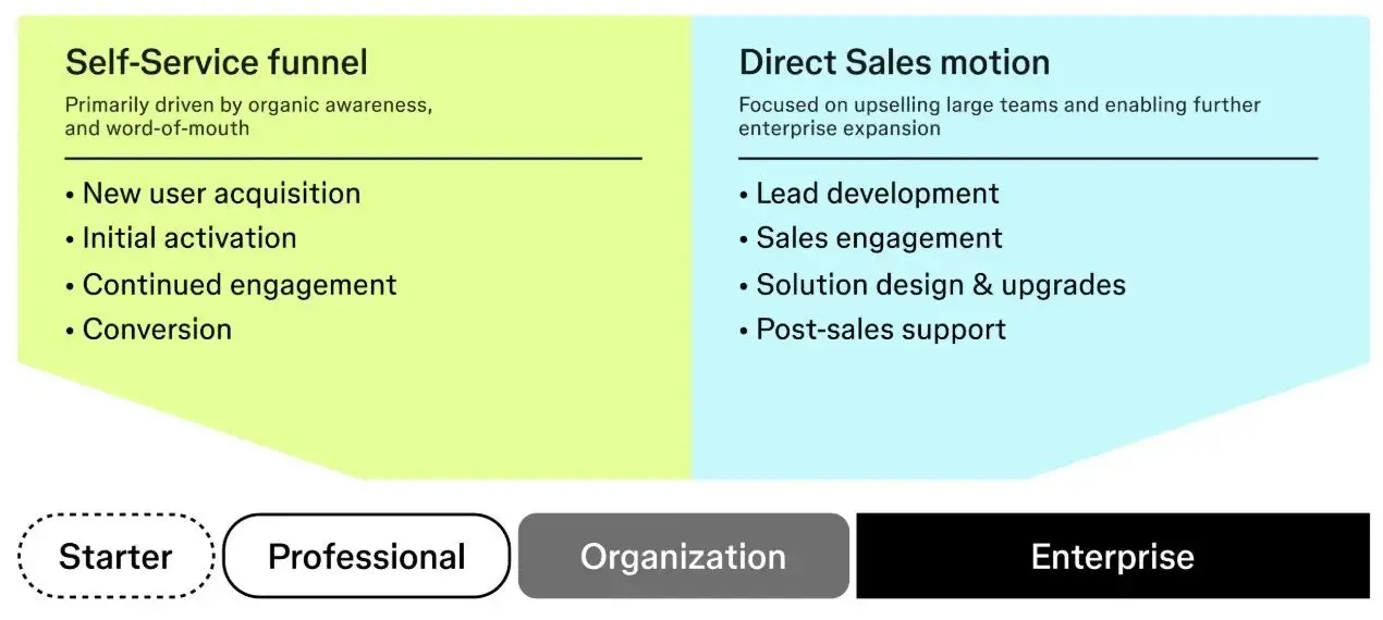 我注意到Figma年付费超过10万美元的大客户数量增长了47%,达到1031家,这些客户贡献了37%的总收入。这种收入集中度反映了平台价值的马太效应:组织规模越大,跨部门协作需求越复杂,越能从多产品协同中获得价值,也越愿意为这种价值支付更高的费用。 大型组织通常有专门的设计团队、产品团队、开发团队、运营团队,这些团队之间的协作效率直接影响企业的竞争力,因此他们对协作平台的价值感知和付费意愿都更强。