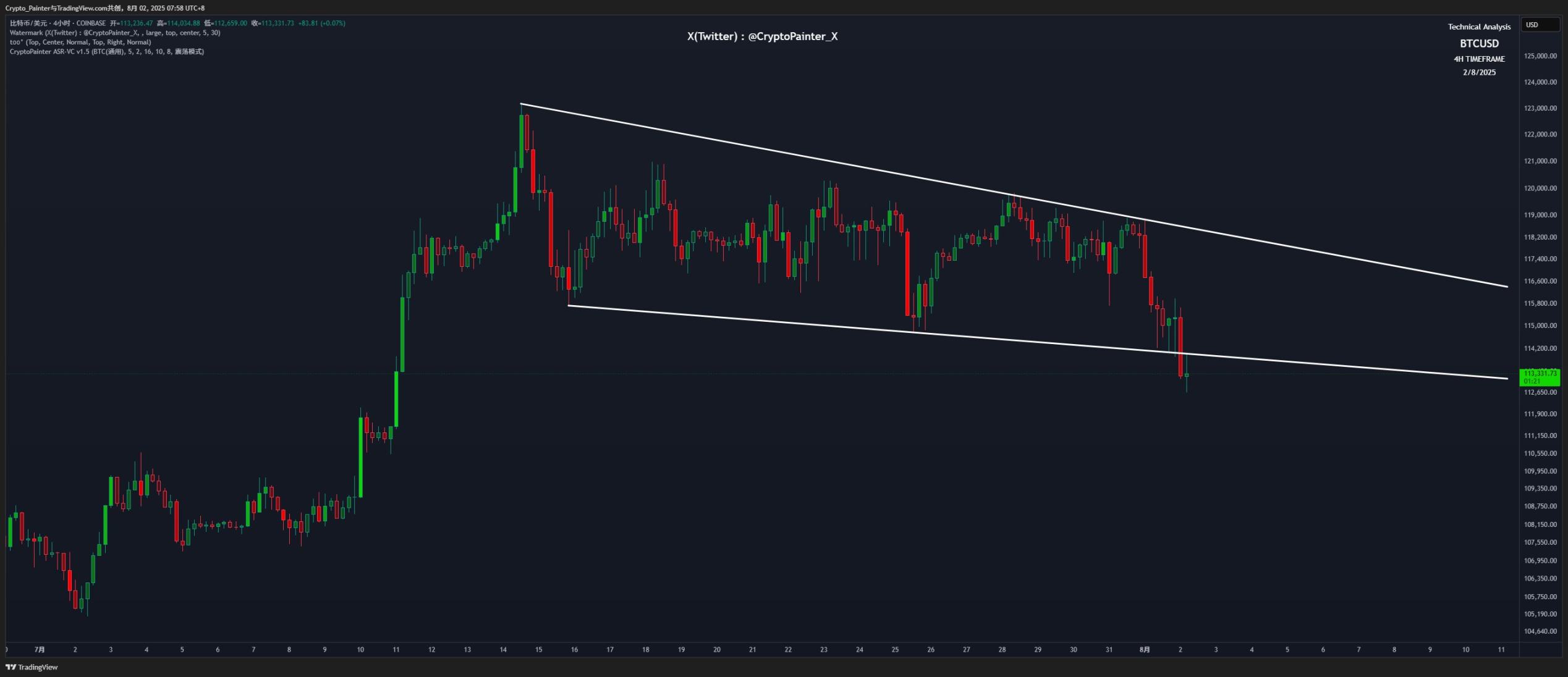 另一位分析师 Crypto Fella 则提出了更为谨慎的看法,「比特币跌破 11.47 万美元的支撑位有可能进一步测试 4 小时图上约 11.2 万美元的支撑区域。」
