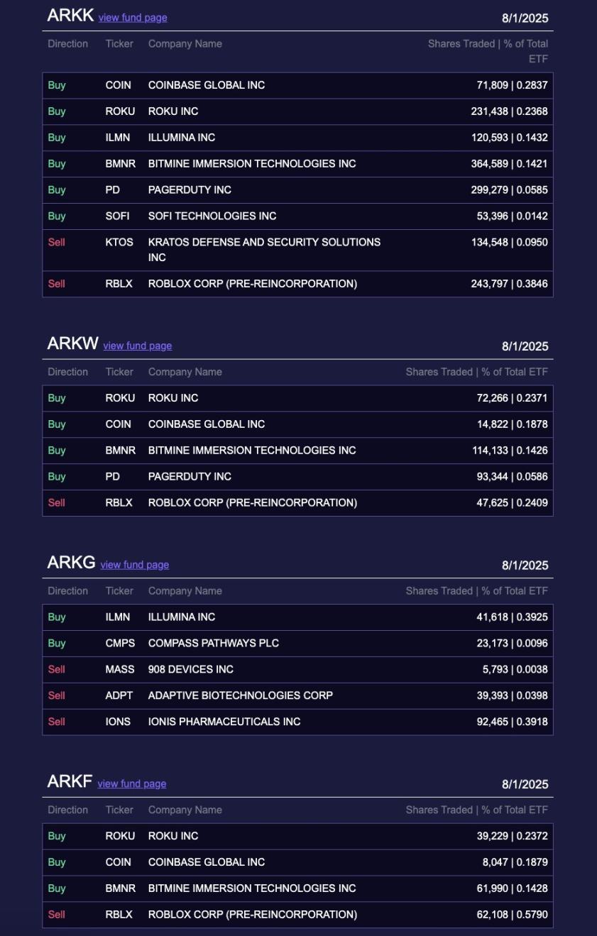 值得注意的是,在市场下行压力加大的背景下,投资机构 ARK Invest 于 8 月 1 日逆势增持,ARK 旗下多只基金同步增持 Coinbase(COIN)股票,ARKK、ARKW 和 ARKF 三只基金合计买入 94,678 股 Coinbase 股票,总价值约 3300 万美元,此外 Ark Invest 买入了约 1870 万美元的 BMNR 股票(采用 ETH 为财务战略的上市公司)。