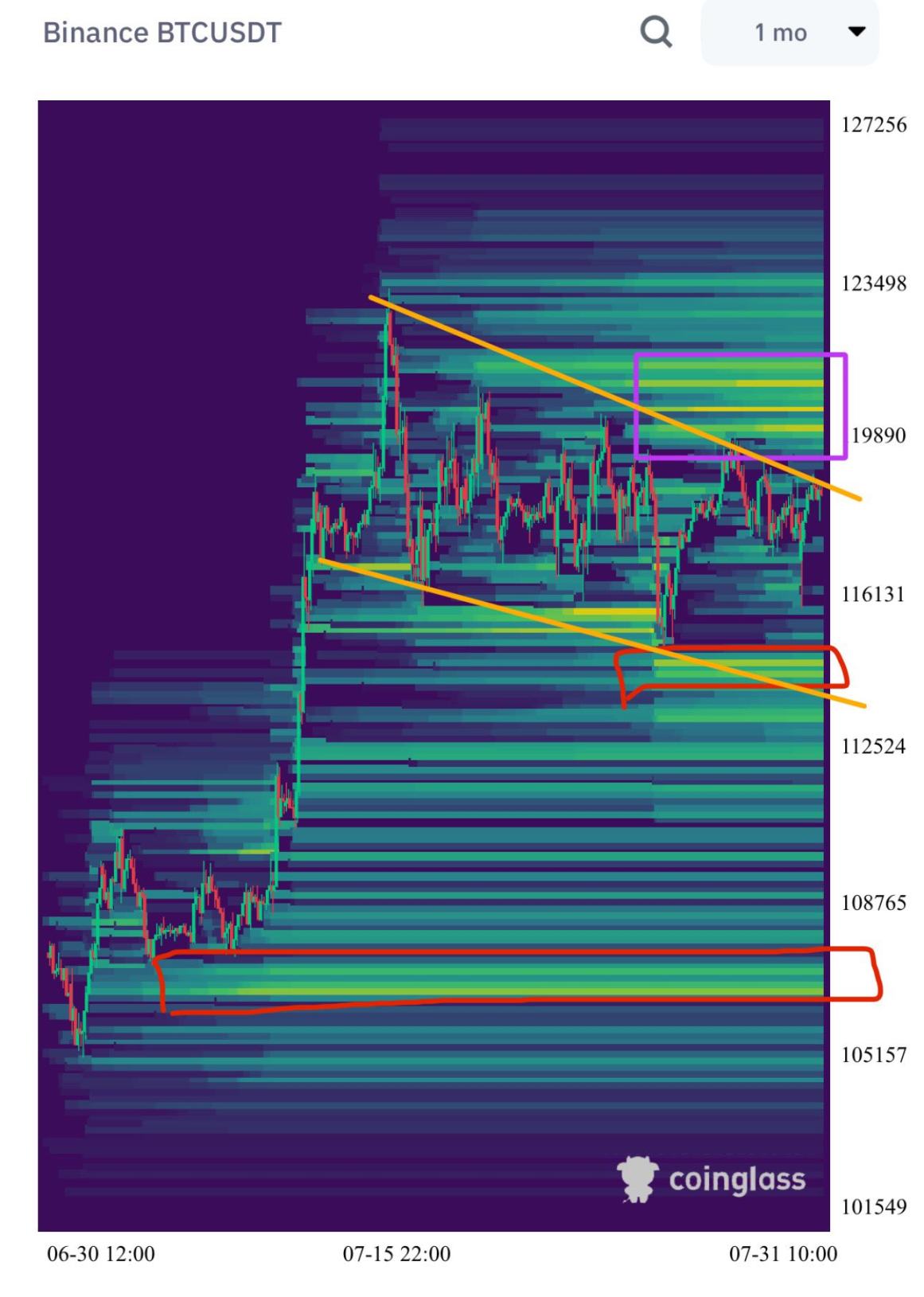 投资机构 DragonFly 分析指出,已标记比特币的关键累积清算区域,认为市场可能先测试上方流动性,再探寻下方流动性区域。值得注意的是,由于比特币形成旗形技术形态,存在不触及底部流动性就直接上行的可能性。尽管当前走势尚不明朗,但他强调密切监控 BTC 流动性分布图对把握后市至关重要。