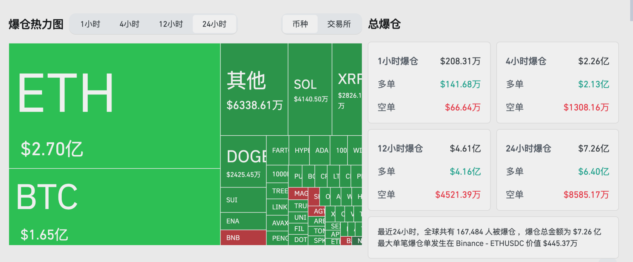 据 Coinglass 数据显示,过去 24 小时全网爆仓 7.26 亿美元,其中多单爆仓 6.4 亿美元,空单爆仓 8685 万美元。且 ETH 近 24 小时爆仓为 2.7 亿美元,超过 BTC 的 1.65 亿美元。
