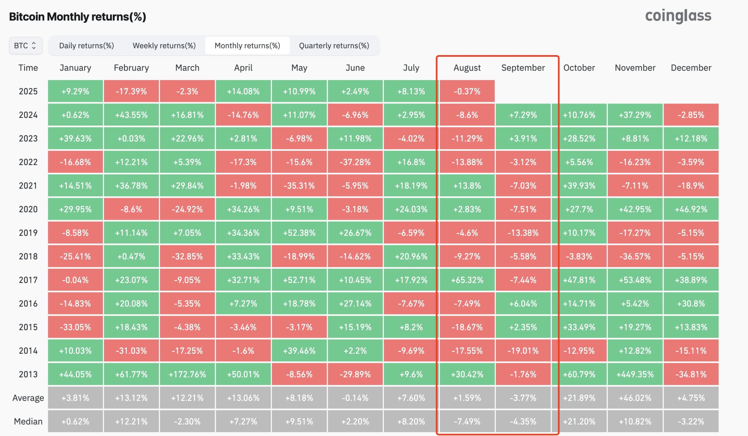 加密市场以往在 8 月的表现向来不好,参考 Lookonchain 的统计,8 月和 9 月历史上是比特币(BTC)表现最差的月份。数据显示,在过去 12 年中,比特币价格有 8 年在 8 月和 9 月出现下跌,下跌概率达 67%。