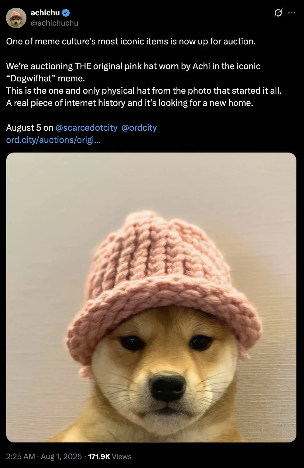 这不是什么名牌设计,也不是历史文物——它是Dogwifhat(WIF)的标志,那只曾经风靡加密世界的柴犬头上的帽子。2024年11月,这顶帽子还是市值超过40亿美元meme币的象征,社区甚至筹集了近70万美元,想要把戴着它的柴犬形象投射到拉斯维加斯的The Sphere巨型球幕上。