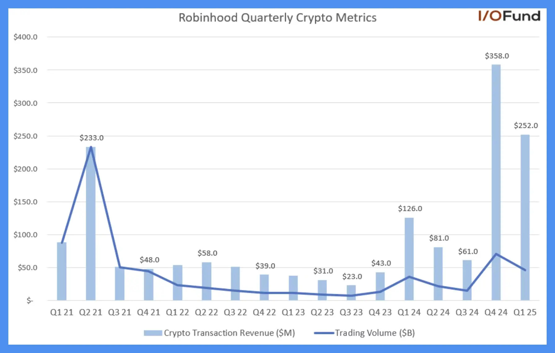 去年第四季度,加密货币贡献了 Robinhood 总净收入的 35% 以上,交易量激增 455%,推动交易收入同比增长 733%,达到 3.58 亿美元,这使得加密货币 Robinhood 成为本季度最大的收入来源。2025 年第一季度,加密货币贡献了总收入的 27% 以上,交易收入同比翻了一番,达到 2.52 亿美元。