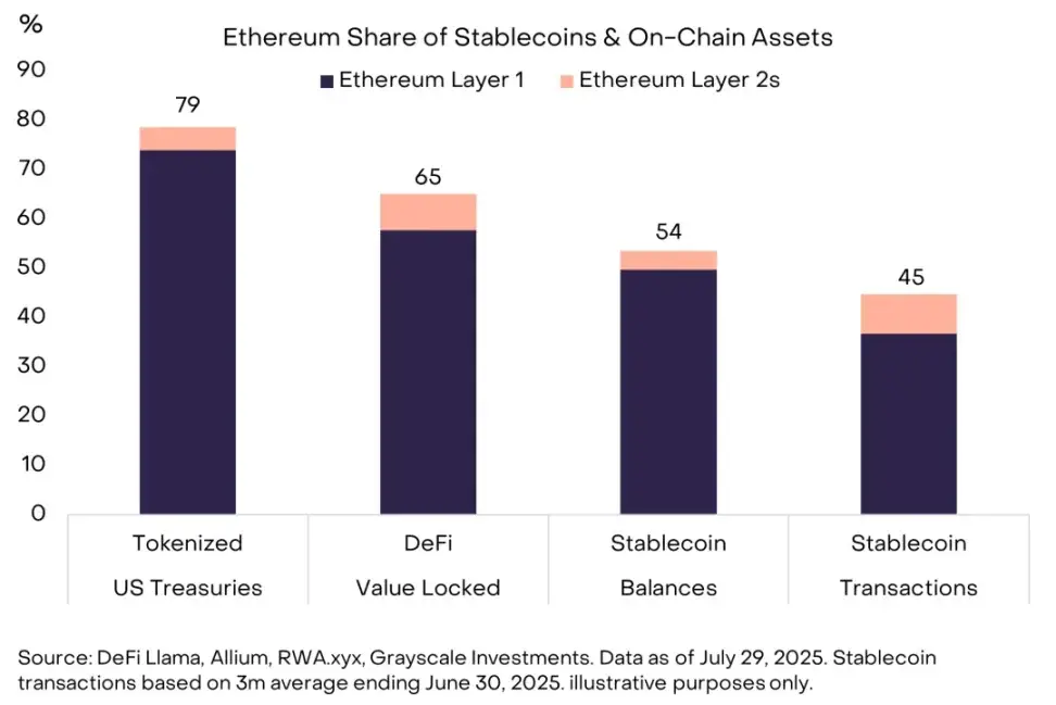 以太坊还是去中心化金融( DeFi )协议中约 65% 锁仓价值的所在地,以及近 80% 的代币化美国国债产品所在地。对于包括 Coinbase 、 Kraken 、 Robinhood 和索尼在内的许多构建加密项目的机构来说,以太坊一直是首选网络。