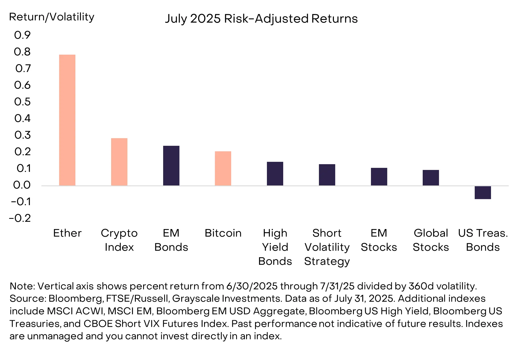 7 月,加密市场因《 GENIUS 法案》的通过而欢欣鼓舞,同时也受到有利宏观市场条件的支撑。全球大部分地区的股市指数上涨,固定收益市场的回报则由高风险板块引领,如美国高收益公司债券和新兴市场债券(见图表 1)。随着市场波动性下降,相关投资策略表现也相当不错。