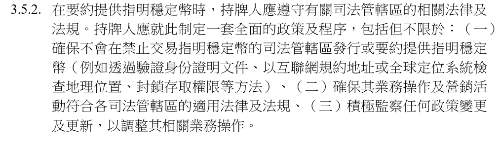 雪上加霜的是根据香港金管局《稳定币发行人监管框架》条文,在 「要约提供指明稳定币」 时,持牌人必须遵守相关司法管辖区的法律与规管要求。此项规定强调,不仅要确保发行合规,还需建立覆盖跨境运营、识别禁区、主动封锁的一整套制度性保障机制。