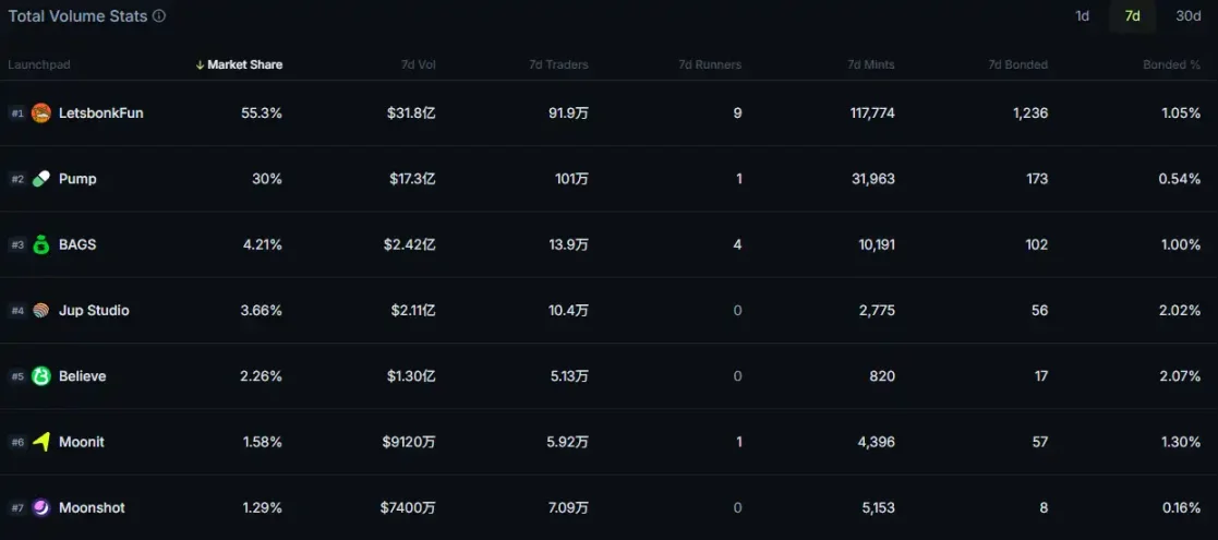 过去的 7 天,Letsbonk.fun 的市场份额仍然超过了 50%,继续保持榜首的位置。pump.fun 声量的回暖,主要是因为「次新币」的优秀表现,其实并没有太多引起广泛讨论的「新币」。