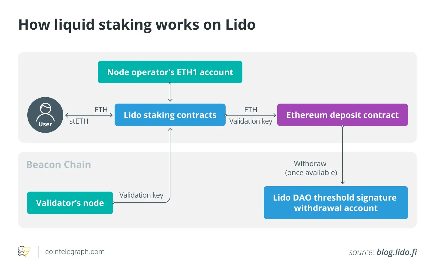 该协议将质押的 ETH 分配给 Lido 网络中的验证者(节点运营商),随后存入以太坊信标链进行验证。这些资金随后被保存在智能合约中,验证者无法访问该合约。通过 Lido 质押协议存入的 ETH 会被分成 32 个 ETH 的集合,由网络上的活跃节点运营商保管。
