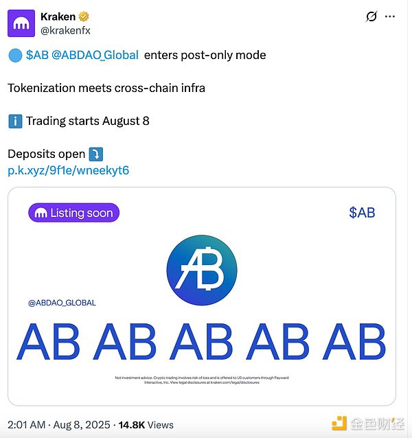AB DAO 宣布,AB 已于 2025 年 8 月 7 日正式上线 Kraken。目前,用户可进行充值并挂限价单(订单暂不成交)。正式交易将于 2025 年 8 月 8 日启动,届时 AB/USD 和 AB/EUR 交易对将全面上线,用户可直接使用美元和欧元进行购买。