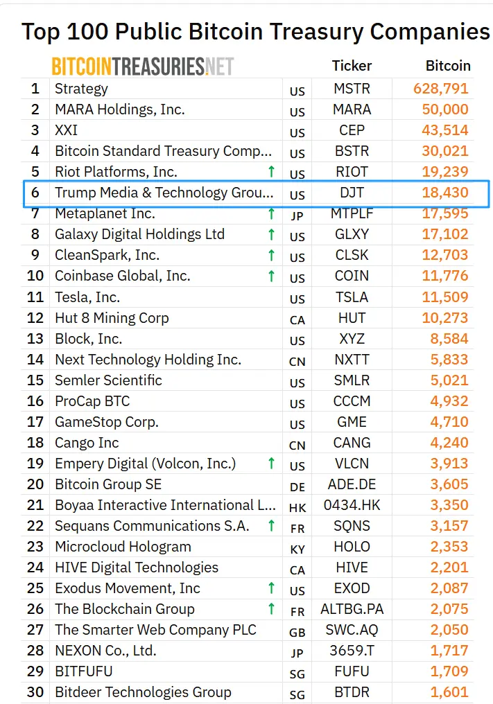 尽管亏损严重,但 Q2 财报中的一项数据格外抢眼:截至 2025 年 6 月 30 日,TMTG 的金融资产已攀升至 31 亿美元 ,年增幅接近 800% 。其中的主因,是其比特币战略的全面推进。公司通过融资筹集了 24 亿美元专项资金用于配置加密资产,并在 7 月持有约 20 亿美元比特币资产,已跻身全球第六大比特币持仓上市公司之列。