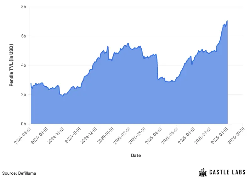Pendle 一直在稳步前进,现已成为链上收益的聚集地。其总TVL近期突破了 70 亿美元,为历史最高水平。