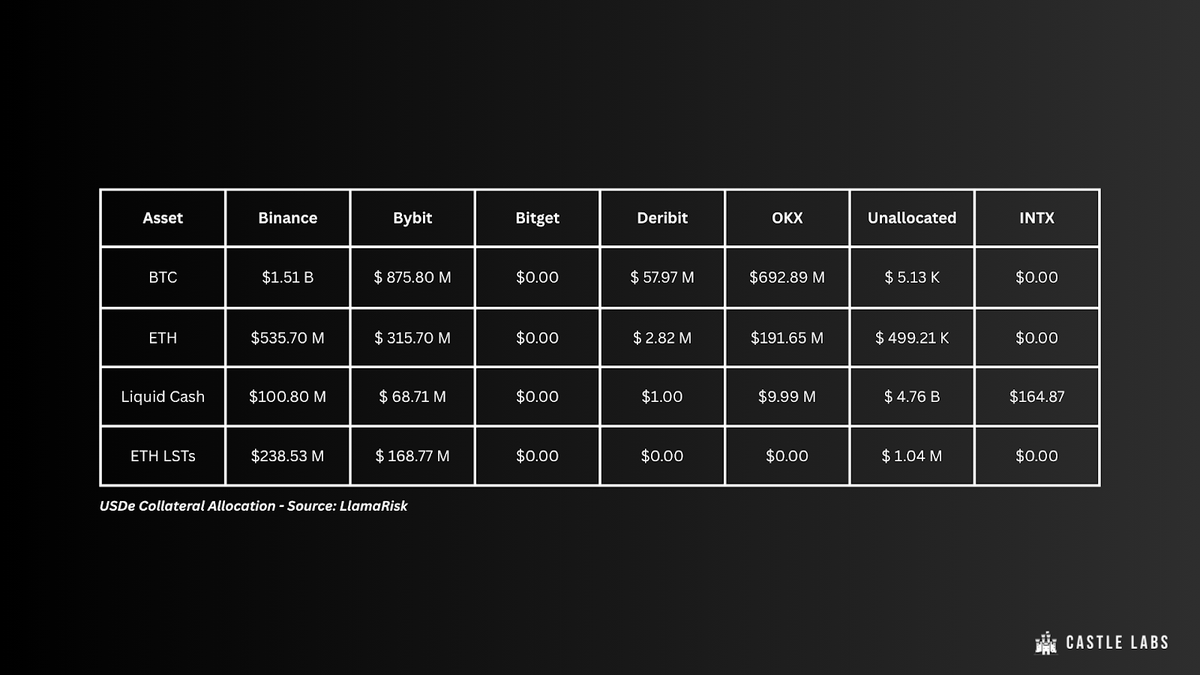Ethena 稳定币 USDe 由 BTC、ETH 和 LST 等波动性资产支持。为了在 Delta 中性环境中运营,Ethena 会将这些波动性资产作为现货头寸进行对冲,并通过随后开空头合约头寸将其用作保证金。