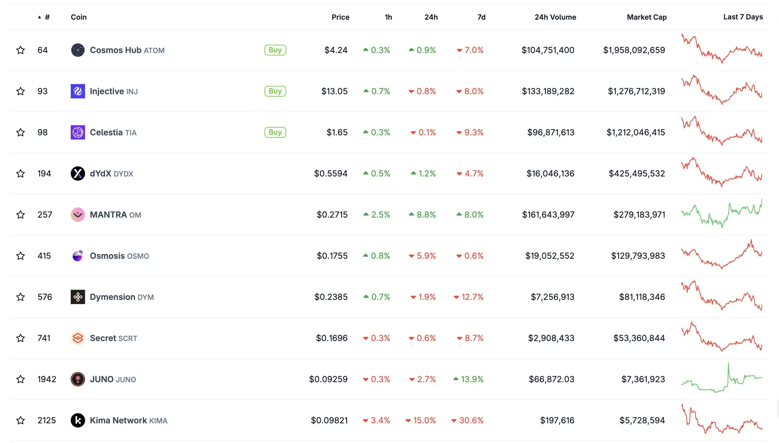截至2025年8月5日,Cosmos 核心代币 ATOM 已经缩水至4.2美元,较最高点跌幅高达 90 %。与此同时,与 2024 年底相比,主要项目 Osmosis(OSMO)下跌79%,JUNO 价格缩水82%几乎归零,就连相对强势的Injective(INJ)也从34 美元回落至 12 美元附近,更不必说Kava、Evmos、Cronos、Fetch.AI普遍下跌......