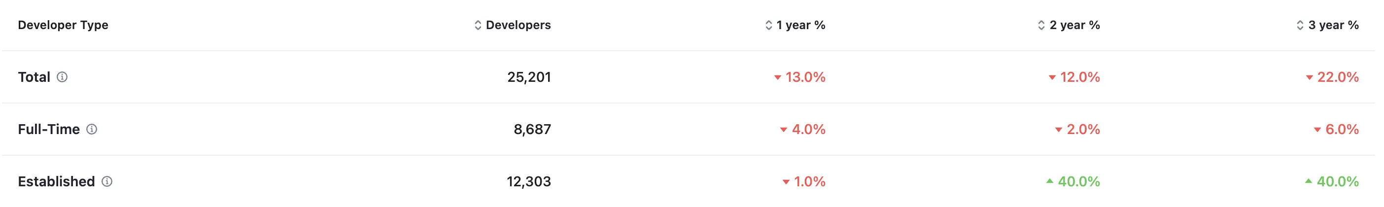 其他多链生态同样低迷:以太坊开发者数量下降 2.54%,BNB Chain 开发指标跌 9.45%,Polygon、Arbitrum、Optimism 和 Avalanche 分别下降 10.35%、7.62%、6.82% 和 12.08%。