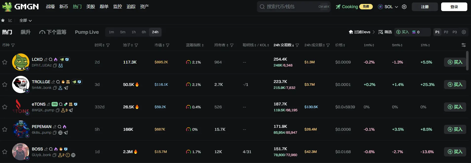 过去 24h Solana 热门代币前五依次为:LCKO、TROLLGE、eTONS、PEPEMAN、BOSS