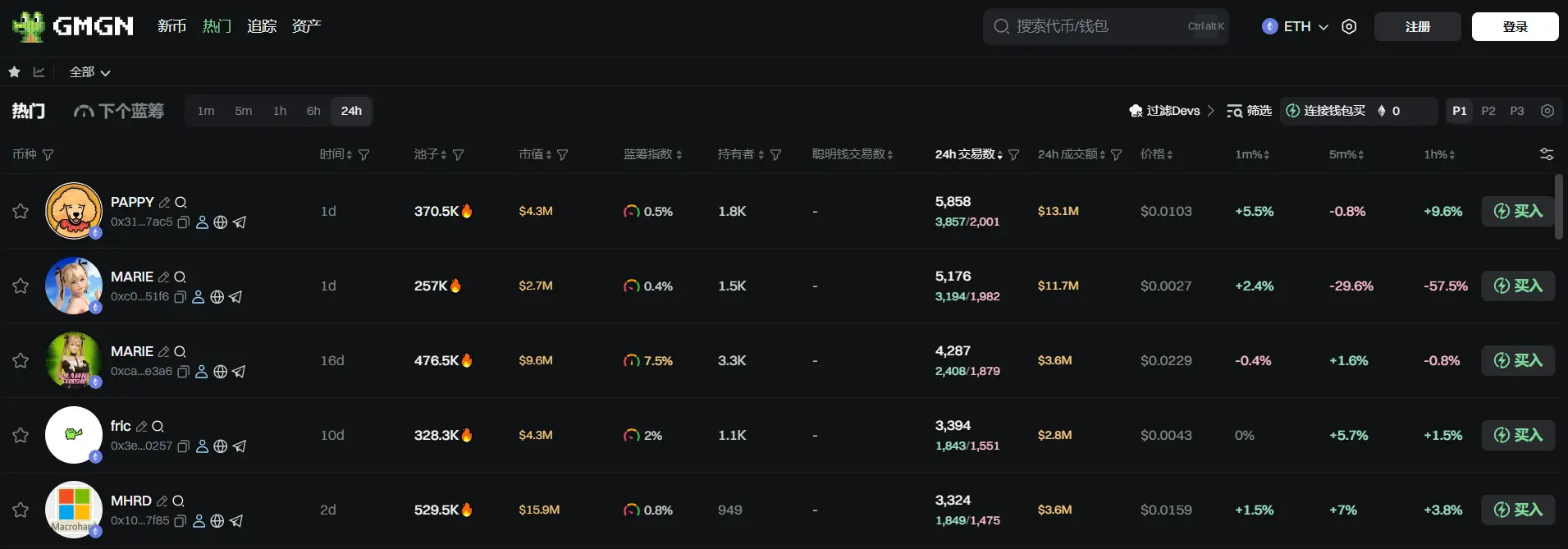 过去 24h 以太坊热门代币前五依次为:PAPPY、MARIE、MARIE、fric、MHRD