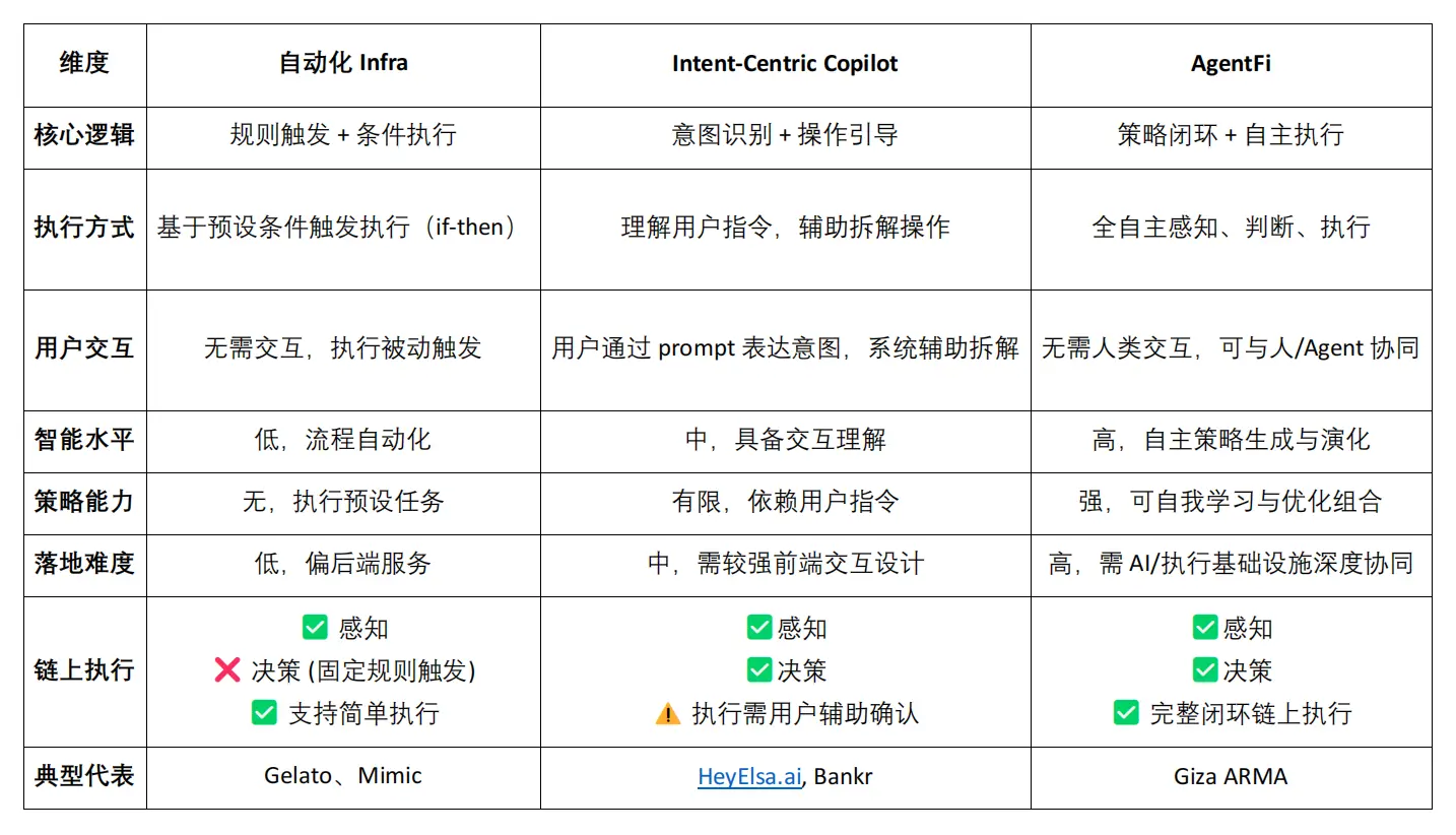 在 DeFi 智能化的演进中,我们可以将系统能力划分为三个阶段: Automation(自动化工具) 、 Intent-Centric Copilot(意图驱动助手) 与 AgentFi(链上智能体) 。