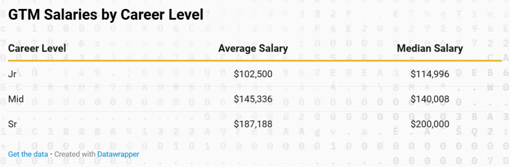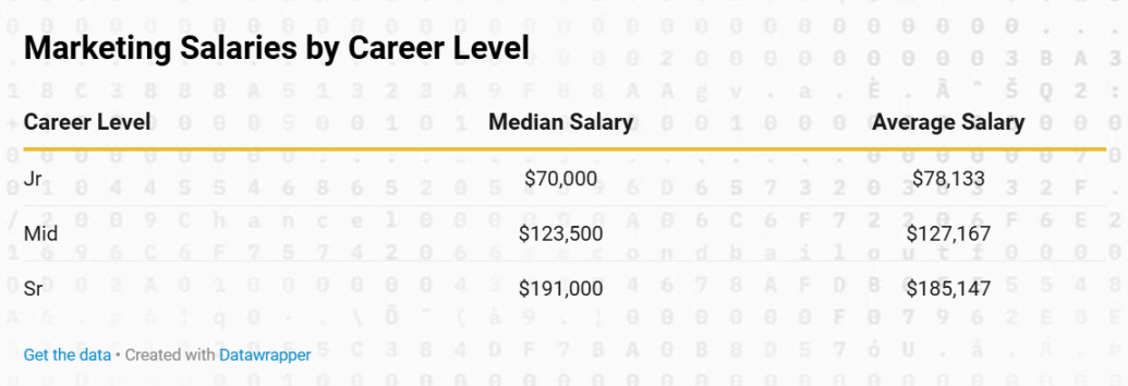 从职业级别来看,初级市场行销人员的中位数基本薪资为 70,000 美元,平均为 78,133 美元。中级专业人士的中位数为 123,500 美元,平均为 127,167 美元,而高级市场行销职位的中位数为 191,000 美元,平均为 185,147 美元。