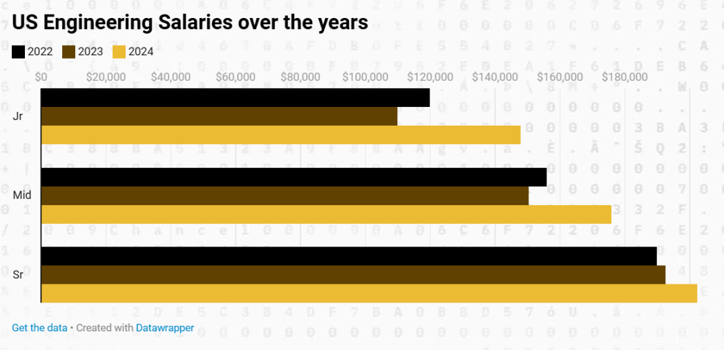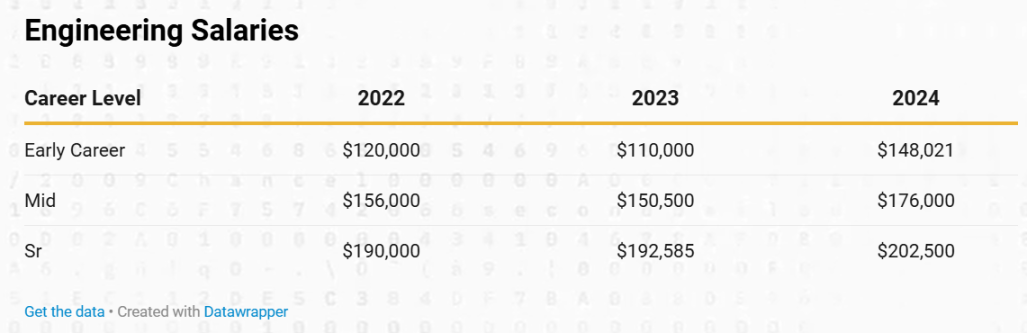 工程类薪资在所有级别均有上涨,其中初级和中级职位的涨幅最大。初级工程师的中位数薪资从 2023 年的 110,000 美元增长至 2024 年的 148,021 美元,涨幅达 25.6%,反映出对初级人才的高需求。中级工程师的薪资也显著增长 14.5%,达到 176,000 美元,而高级工程师的薪资涨幅较为温和,为 4.9%,达到 202,500 美元,表明薪资增长在更高级别趋于稳定。