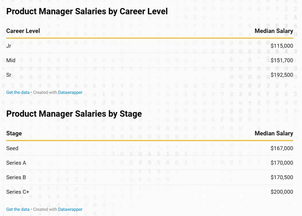 初级产品经理的中位数基本薪资为 115,000 美元,中级为 151,700 美元,高级为 192,500 美元。