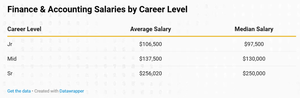 2024 年初级财务与会计职位的平均薪资为 106,500 美元,中位数为 97,500 美元。中级职位的平均为 137,500 美元,中位数为 135,000 美元,高级职位的平均为 256,020 美元,中位数为 250,000 美元。这些数据清晰地展示了随著经验和职位的晋升,薪酬逐步提升。