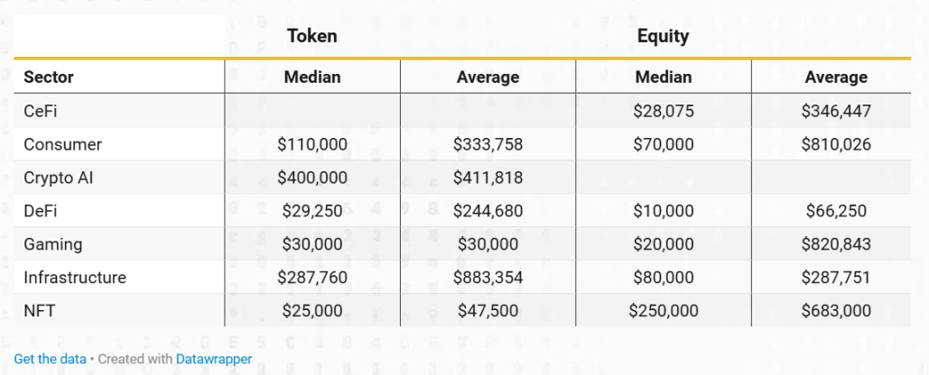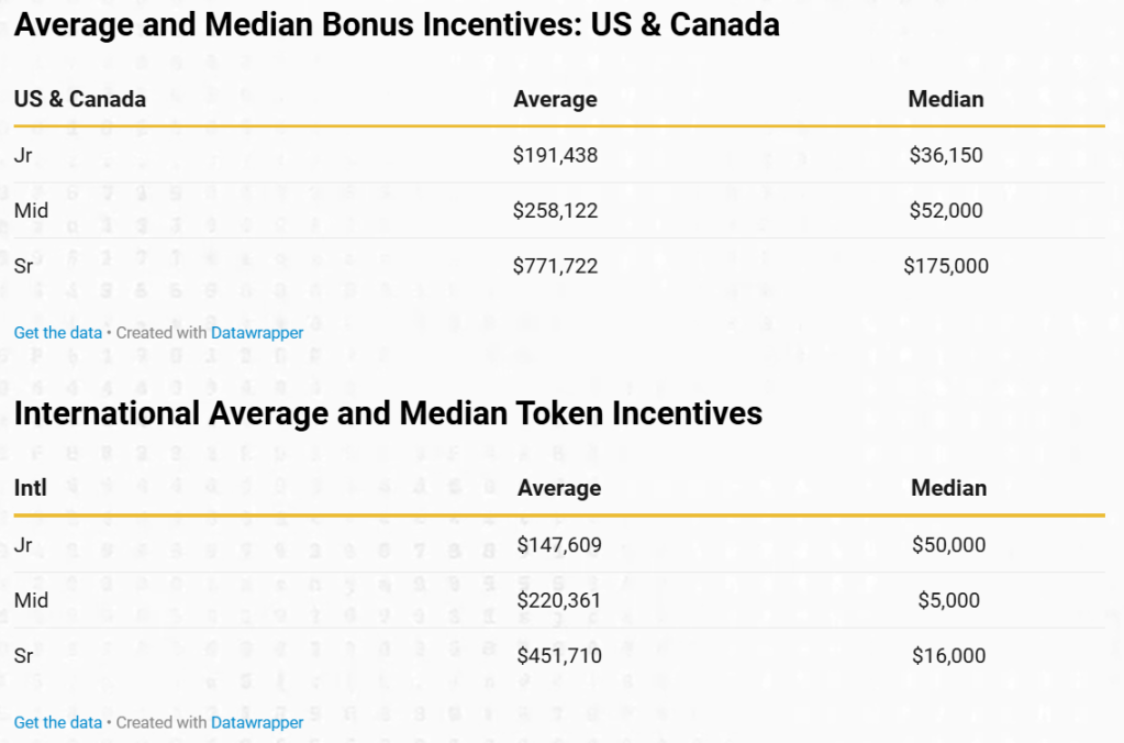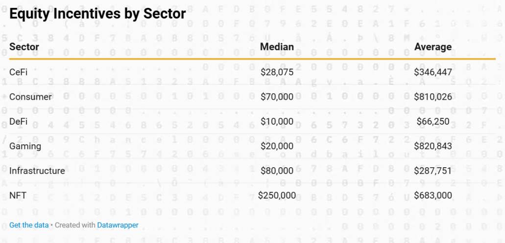 中位数股权激励因领域而异。DeFi 专案最低,为 10,000 美元,CeFi 为 28,075 美元,游戏为 20,000 美元。以消费者为中心的领域为 70,000 美元,基础设施为 80,000 美元。NFT 领域的中位数股权激励最高,达到 250,000 美元。