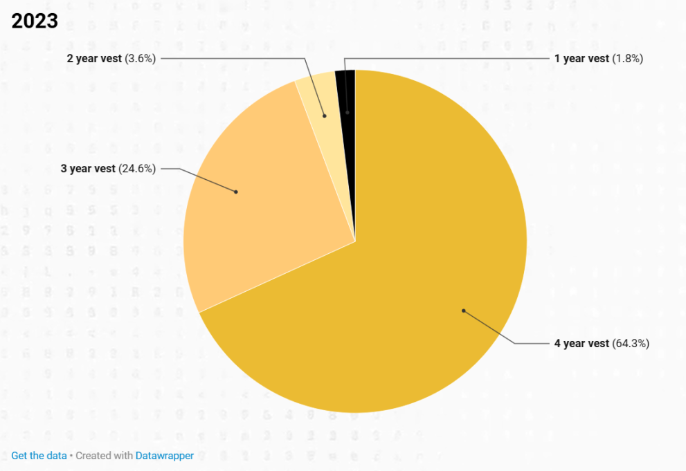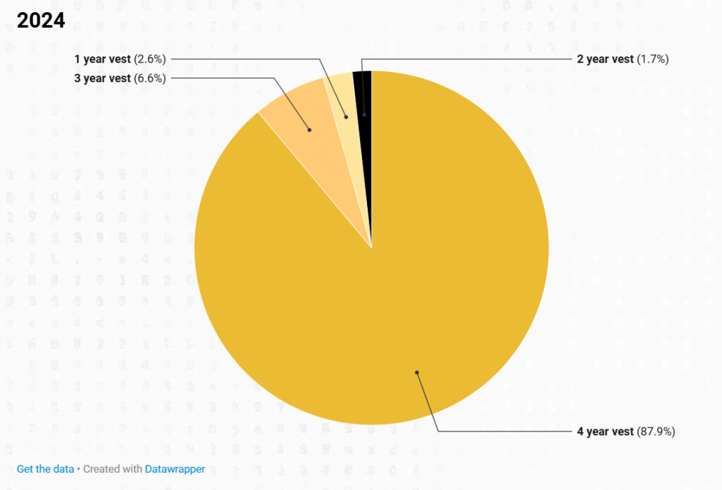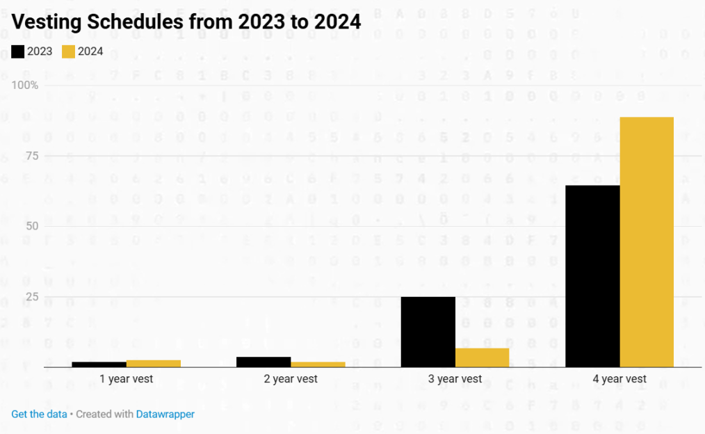 绝大多数代币锁仓期为四年,2023 年占 64.3%,2024 年上升至 87.85%。相比之下,较短的锁仓期(一年、两年或三年)占比较小。2023 年,它们在 1.80% 至 24.60% 之间,2024 年在 1.72% 至 6.58% 之间。这一数据表明市场明显偏好较长的锁仓期,尤其是在 2024 年。