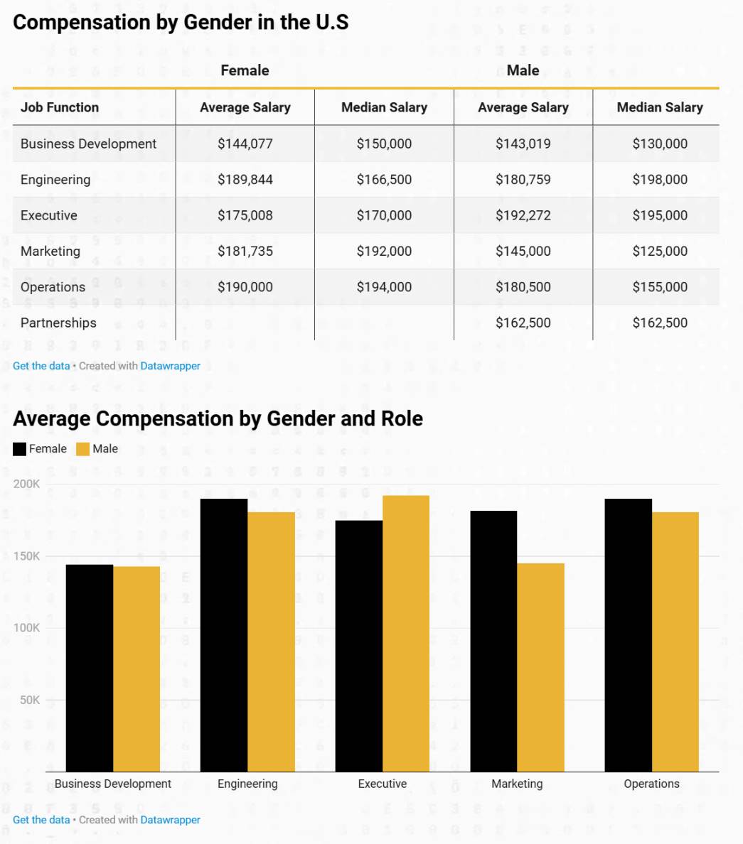 平均而言,女性的薪资略高于男性,但高阶主管职位除外。从中位数来看,女性在市场行销、营运和业务发展领域的薪资更高,但在工程和高阶主管职位上并非如此。