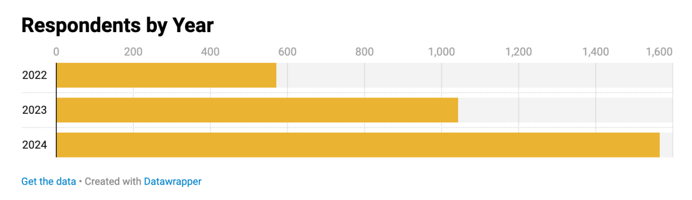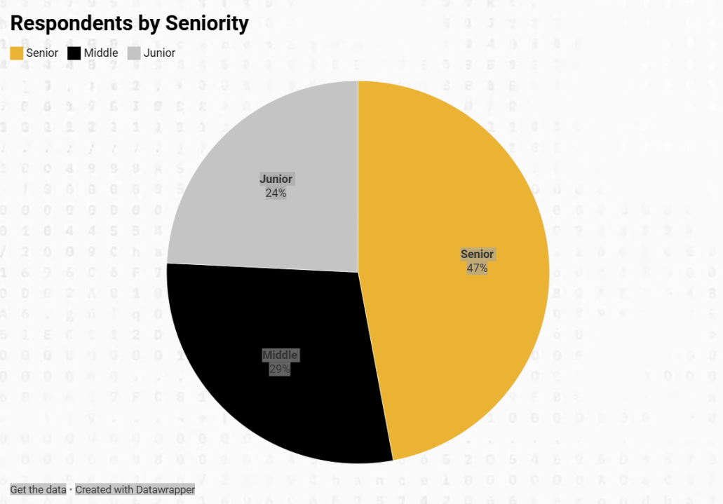 调查结果更偏向经验丰富的群体,大多数提交者被归类为「高级」职员(即拥有六年以上工作经验)。职业级别的分类如下:初级(1-3 年经验)、中级(3-6 年经验)、高级(6 年以上经验)。