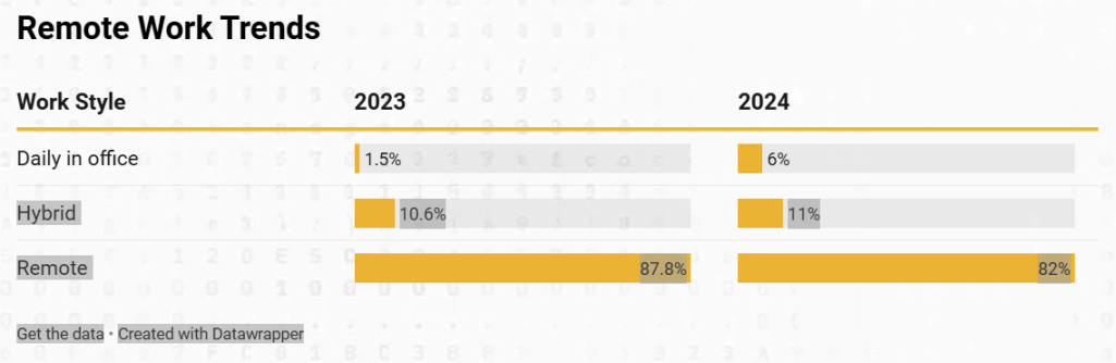 作为年度区块链薪酬调查的一部分,我们收集了产业内工作场所安排的数据。以下是 2024 年与 2023 年相比的工作偏好和趋势。