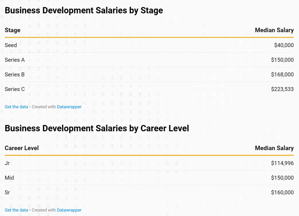 业务发展职位的基本薪资在公司阶段和职业级别上均有显著增长。种子阶段的中位数基本薪资为 40,000 美元,A 轮升至 150,000 美元,B 轮为 168,000 美元,C 轮为 223,533 美元。从职业发展来看,初级职位的中位数为 114,996 美元,中级为 150,000 美元,高级为 160,000 美元。