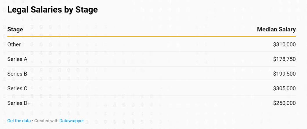 法律职位的薪酬通常随著公司融资阶段的推进而增长。在 A 轮阶段,中位数基本薪资为 178,750 美元,B 轮升至 199,500 美元。到 C 轮阶段,法律专业人士的薪资显著增长至 305,000 美元。这些数据展示了法律职位薪酬如何与公司的成长和成熟同步增长。